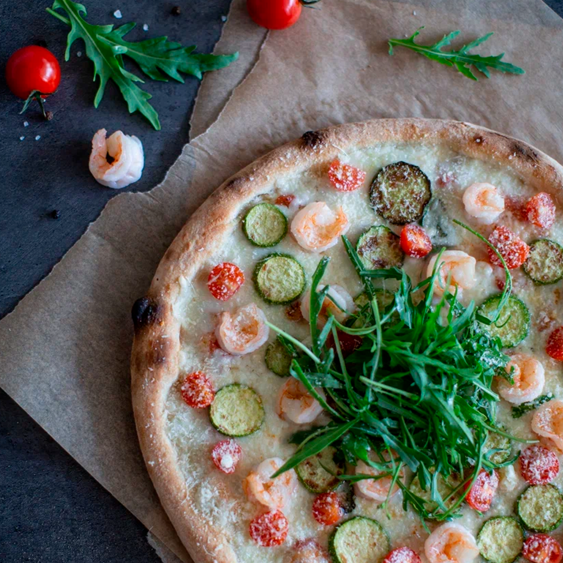 Prawns, roasted garlic butter, sundried tomatoes, zucchini, mozzarella, tomatoes, Grana Padano, and rocket salad