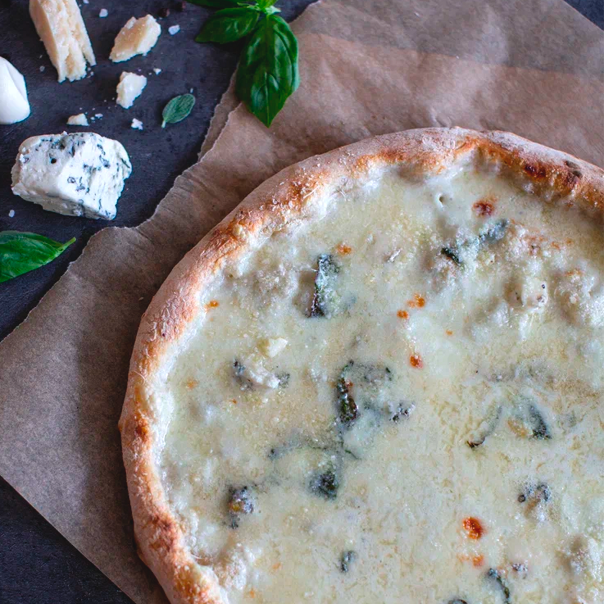 Gorgonzola, ricotta, grana padano, scamorza cheeses, basil, and mozzarella