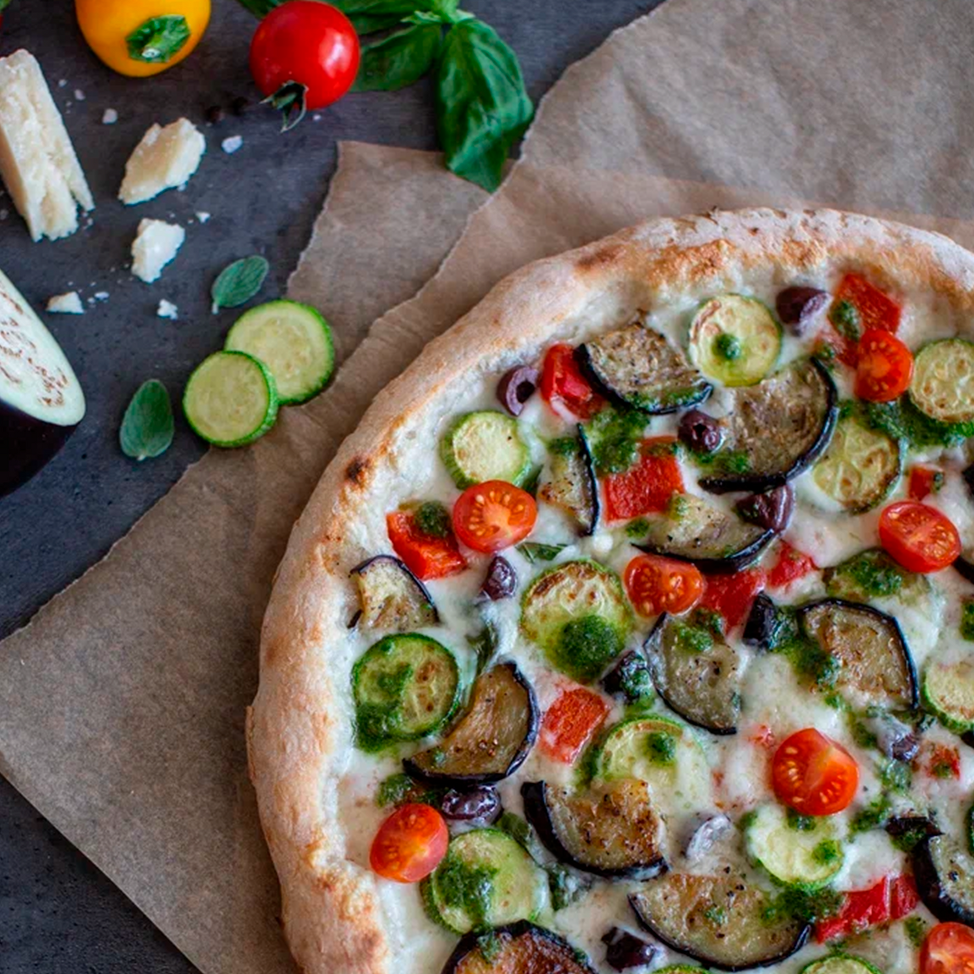 Eggplants, peppers, sautéed onions, zucchini, olives, pesto, tomatoes, and mozzarella